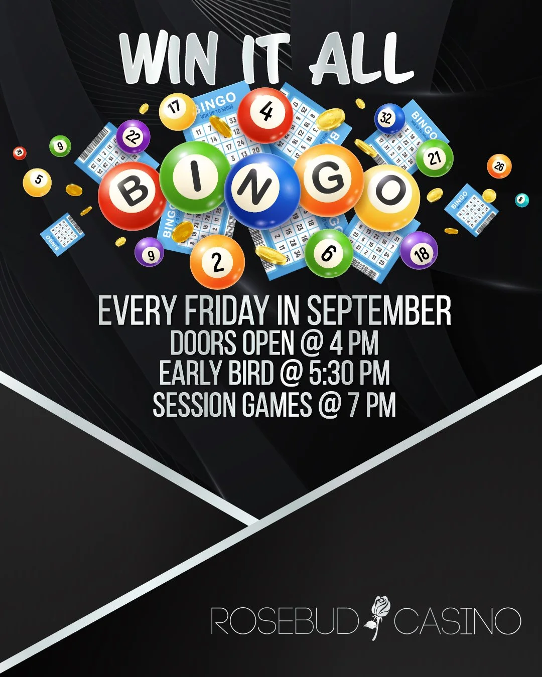 Visit the Rosebud Casino Friday, October 21st, for Win it All Bingo. Doors open at 4 pm, early bird at 5:30 pm, and session games at 7 pm.