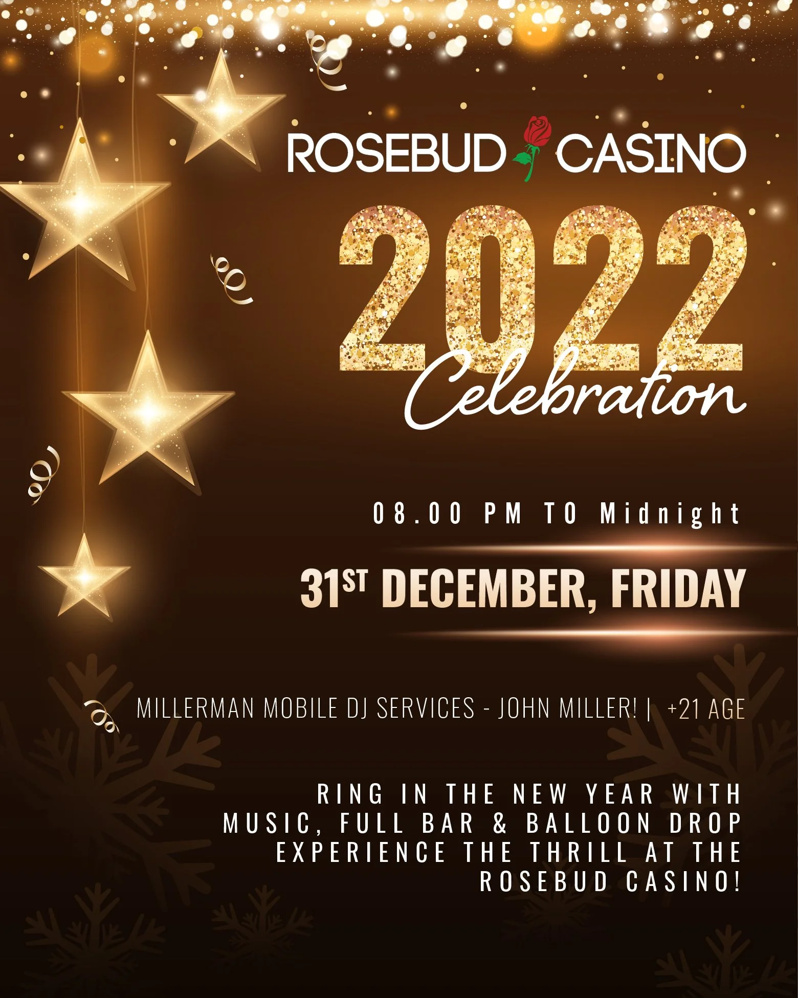 New Year’s Eve Celebration Friday, December 31, 2021 8:05 PM 11:55 PM Rosebud Casino 30421 U.S. 83 Valentine, NE, 69201 United States (map) Google Calendar ICS Join us on New Year’s Eve to ring in the new year! We’ll have MILLERMAN Mobile DJ Services, John Miller DJing in the entertainment center with a full bar and a balloon drop at Midnight!