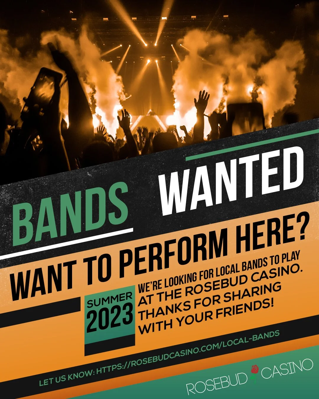 We’re looking for bands who are interested in performing at the Rosebud Casino on a regular basis. Please let us know about your performance.