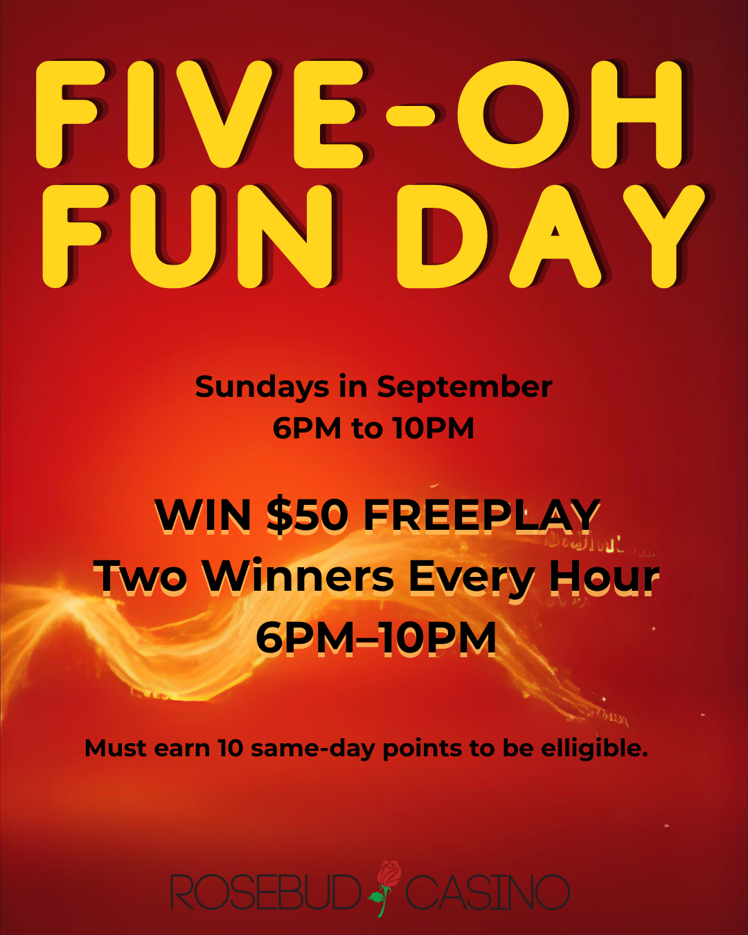 Make your Sundays fun and rewarding at the Rosebud Casino! Join us for Five-Oh Fun Day every Sunday in September, where you have multiple chances to win a fantastic Free Play prize!
