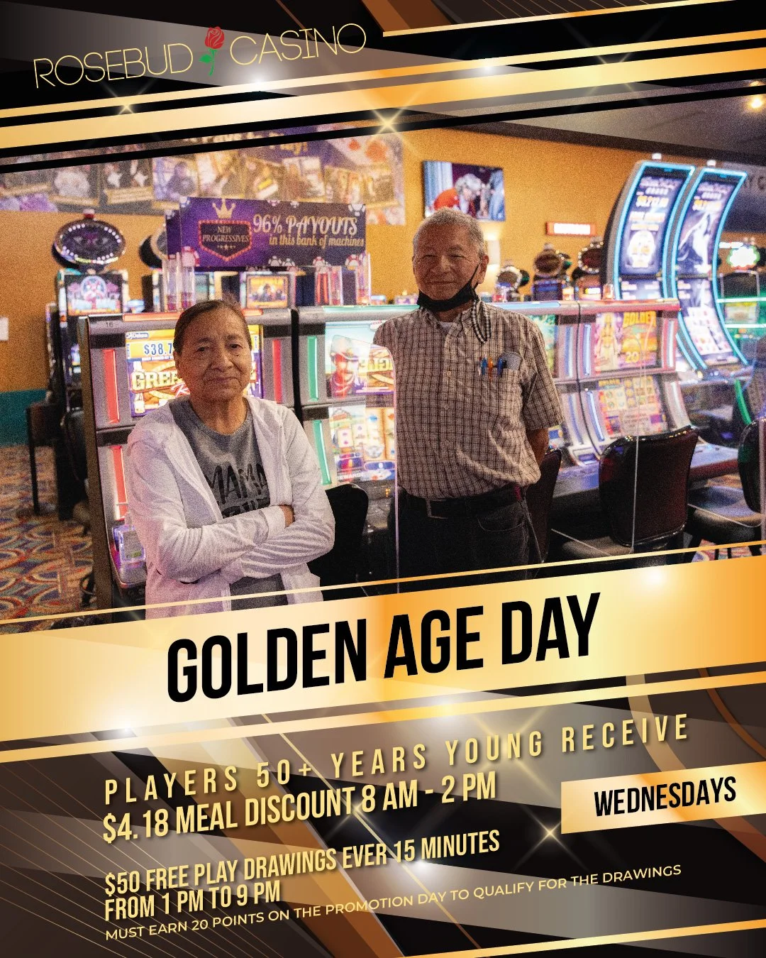 Attention players 50 and above! Wednesdays at the Rosebud Casino are packed with excitement. Enjoy a meal discount from 8 am to 2 pm, and get ready for the thrill of $50 free play drawings every 15 minutes, starting at 1 pm until 9 pm. Discover the golden rewards that await you at the Rosebud Casino!