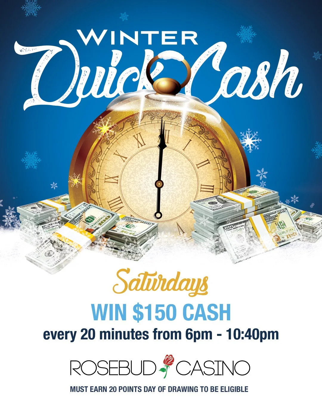 We have $150 Cash Drawings Every 20 Minutes this Saturday from 6 pm to 10:40 pm at the Rosebud Casino 💵😀.
