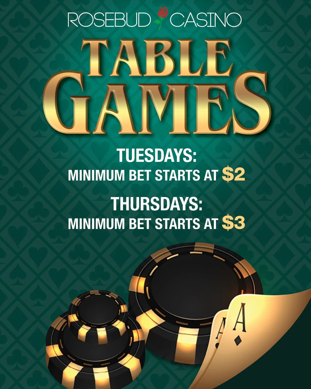 Every Tuesday Minimum Bets are $2 and Every Thursday Minimum Bets are $3 at Table Games.