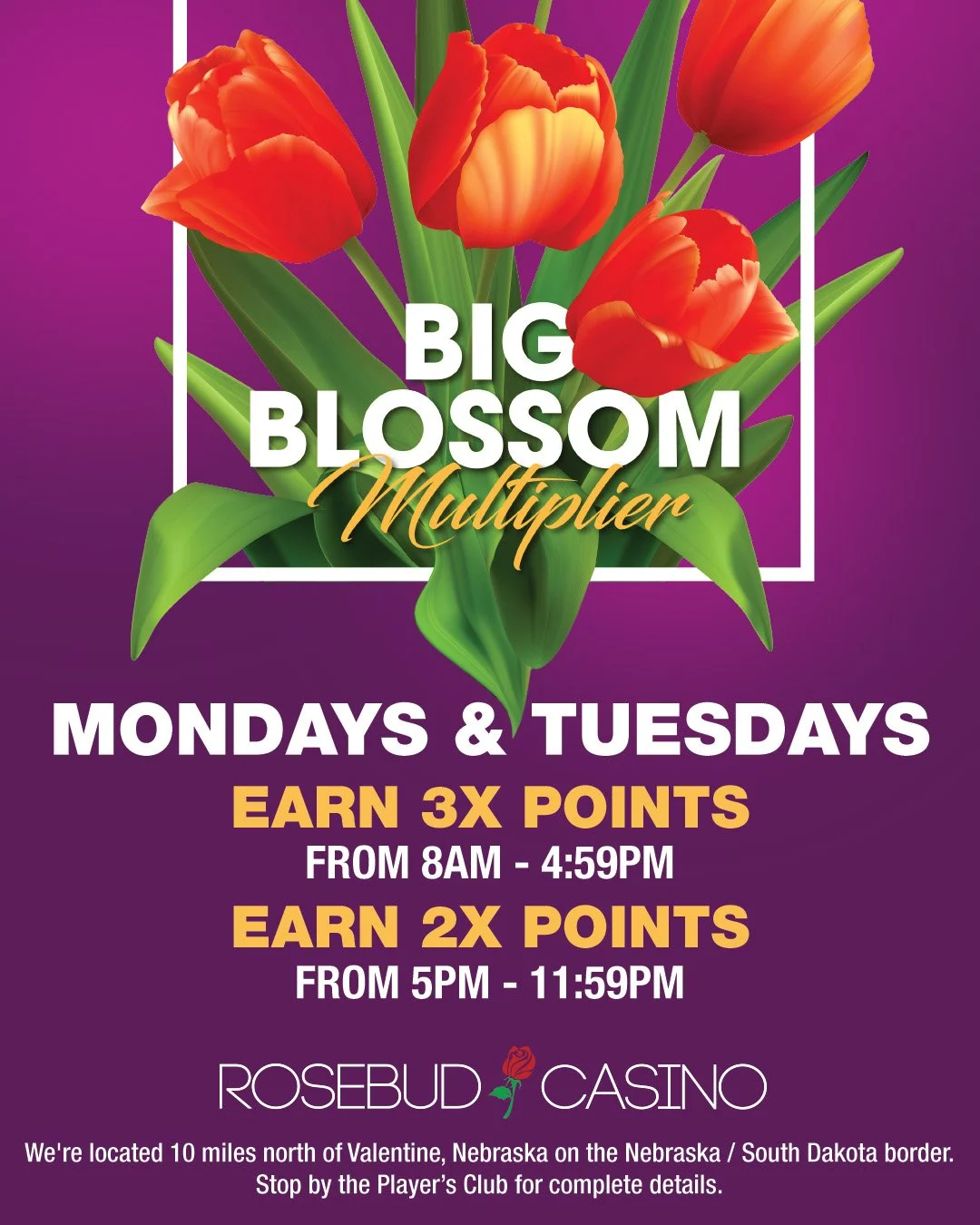 Start your week with a winning streak at the Rosebud Casino! Join us on Mondays and Tuesdays for Big Blossom Multiplier. From 8 am to 4:59 pm, earn 3x points on your favorite games. Not an early bird? No worries! From 5 pm to 11:59 pm, you still get 2x points. Double the points, double the fun!