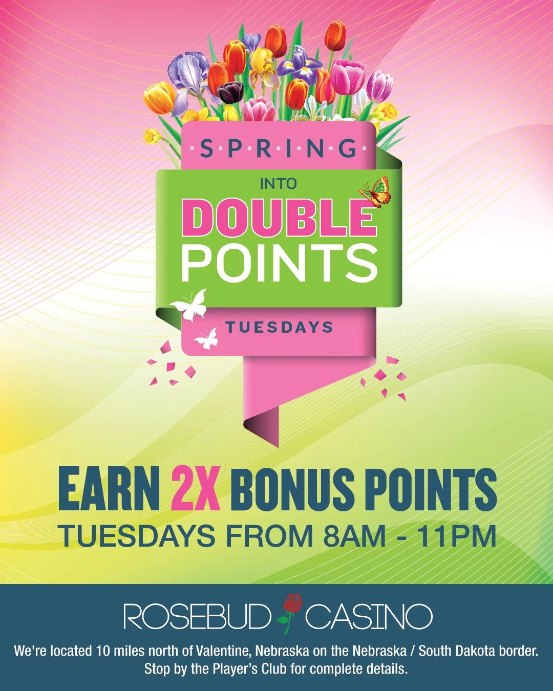 Back to All Events Spring Into Double Points Tuesday, April 1, 2025 8:00 AM 11:00 PM Rosebud Casino 30421 U.S. 83 Valentine, NE, 69201 United States (map) Google Calendar ICS 🌸 Double the Fun, Double the Points! 🌸Spring is here, and so are double points at the Rosebud Casino! This Tuesday from 8 am to 11 pm, earn 2x bonus points while playing your favorite games. More points, more fun, more chances to win! See you there! 🎰🌷