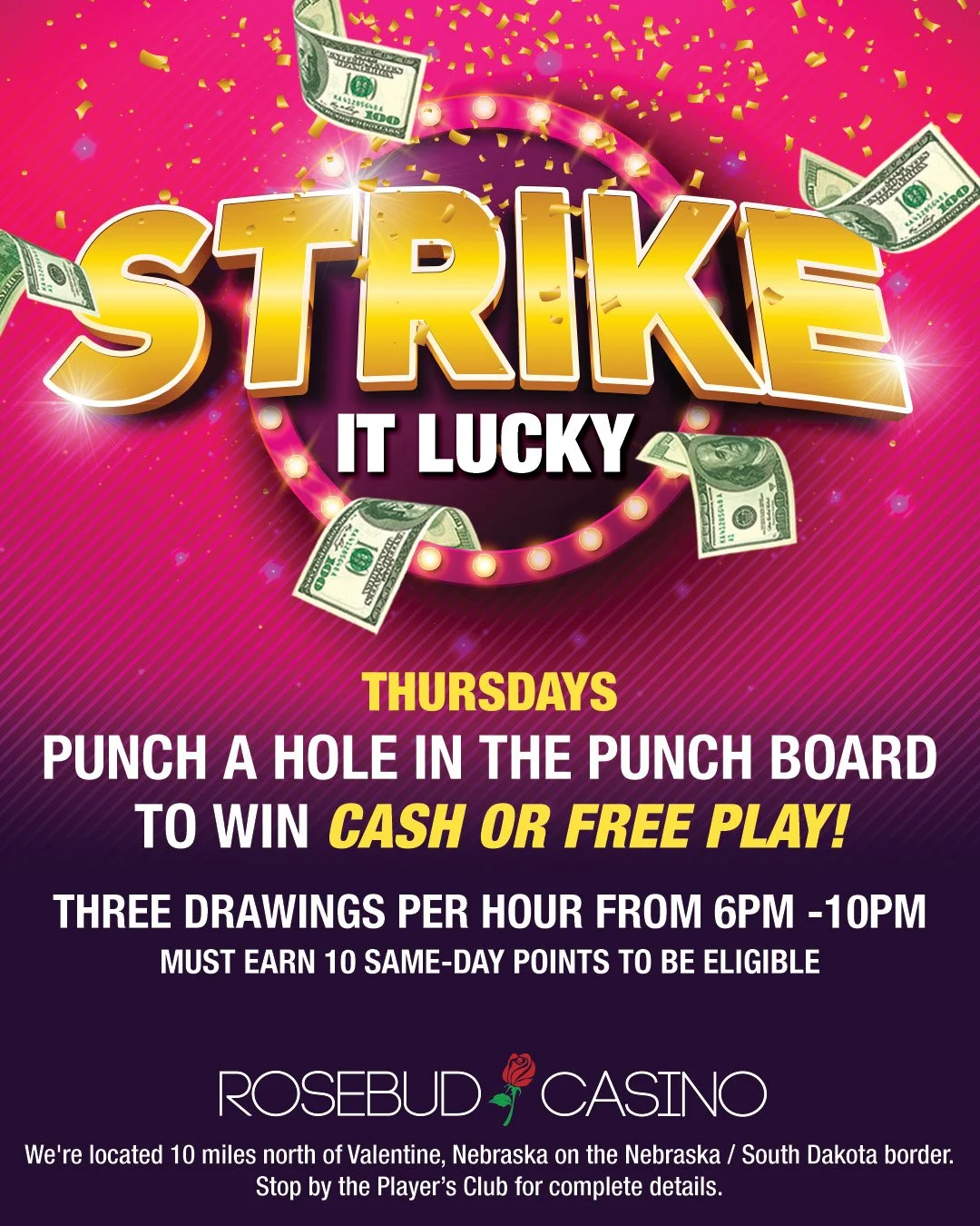 Strike it Lucky Thursday, April 10, 2025 6:00 PM 10:00 PM Rosebud Casino 30421 U.S. 83 Valentine, NE, 69201 United States (map) Google Calendar ICS 🏆 Punch the Board, Win up to $100! 🏆Visit the Rosebud Casino this Thursday and Strike it Lucky! Three winners every hour from 6 pm–10 pm punch to instantly win prizes, including the top rewards of $100 cash or $100 in free play. Just 10 points qualifies you to win! 🥳🎰