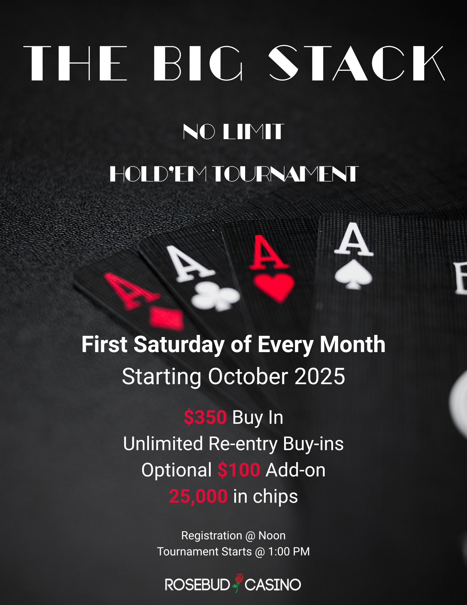 Are you ready for a high-stakes poker challenge? Join the Rosebud Casino for The Big Stack No Limit Hold'em Tournament, a thrilling monthly event designed for serious poker players.