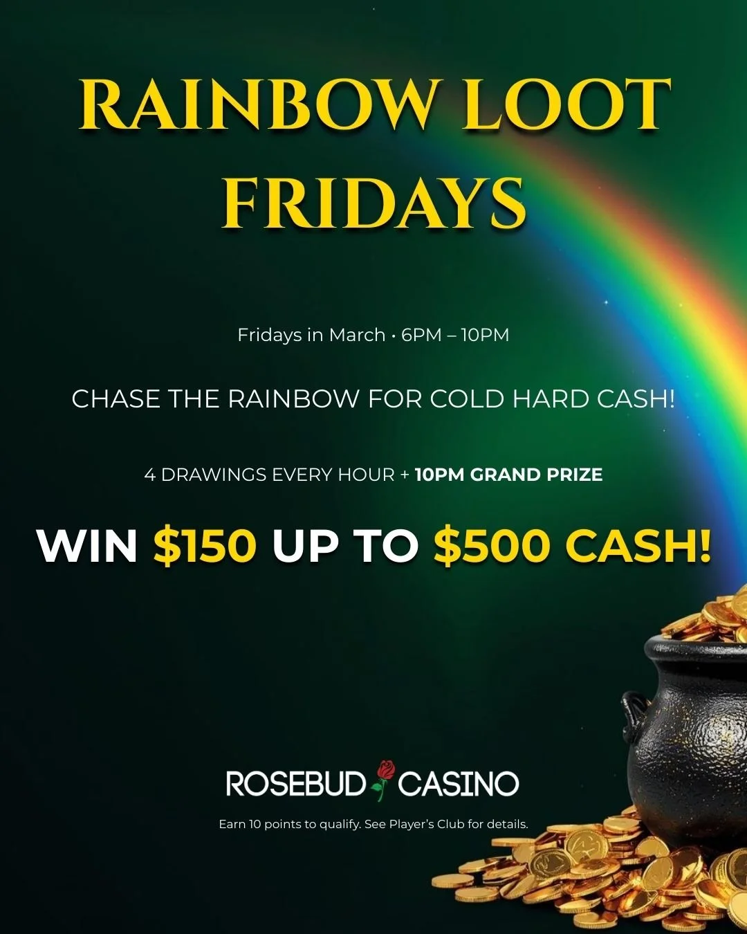 Fridays in March are your time to shine at the Rosebud Casino. We are turning up the heat with a night of cash giveaways that grow bigger as the evening goes on. Join us for Rainbow Loot Fridays and see if you can catch the grand prize at the end of the night!