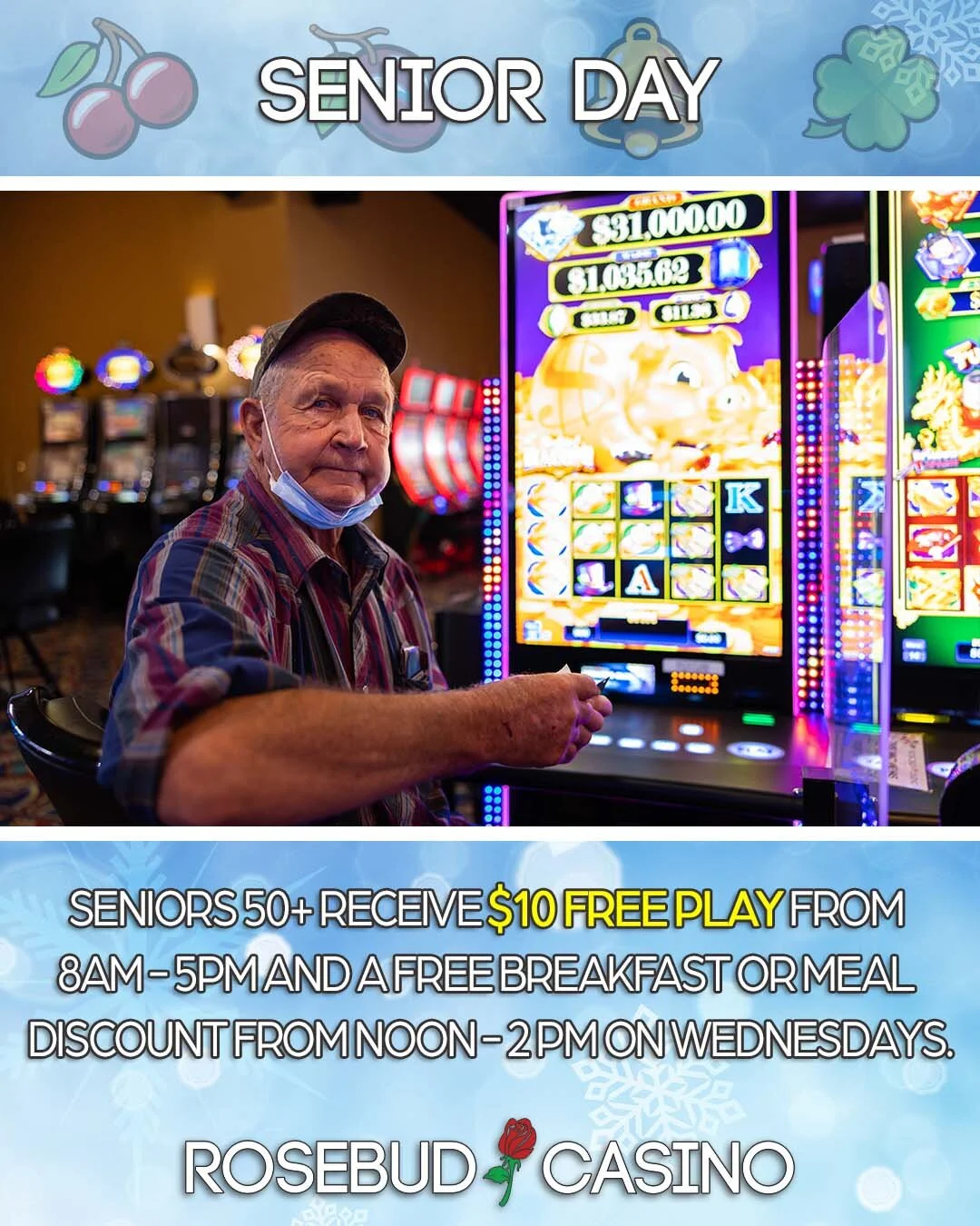 On Wednesdays, seniors 50+ receive $10 free play from 8 am to 5 pm and a free breakfast or meal discount from noon until 2 pm.