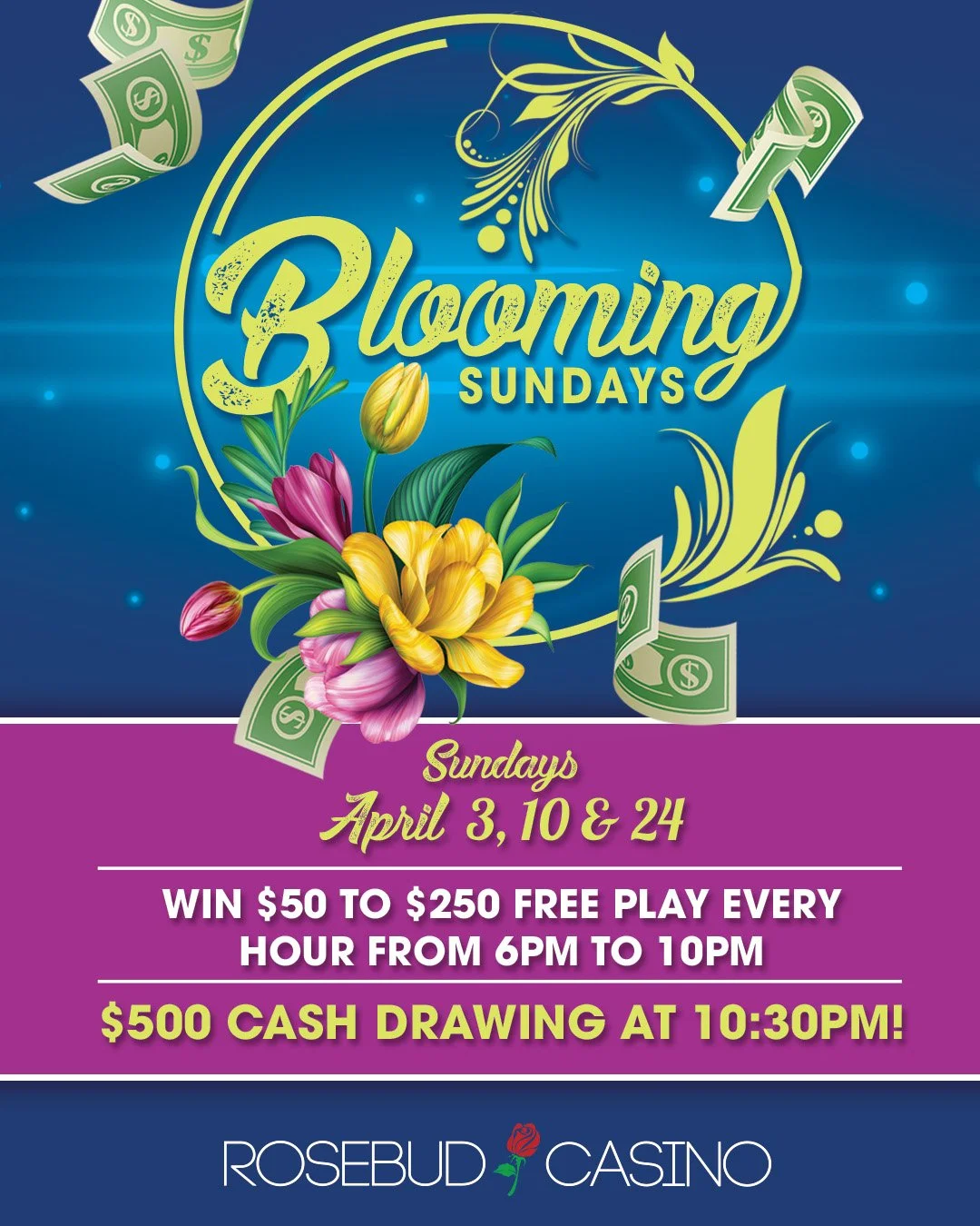 Sunday, April 3rd, 10th & 24th, visit the Rosebud Casino for Blooming Sundays! You can win $50 to $250 in free play every hour from 6 pm to 10 pm, and then at 10:30 pm, there will be a $500 cash drawing! Come and experience the thrill at the Rosebud Casino 🎰.