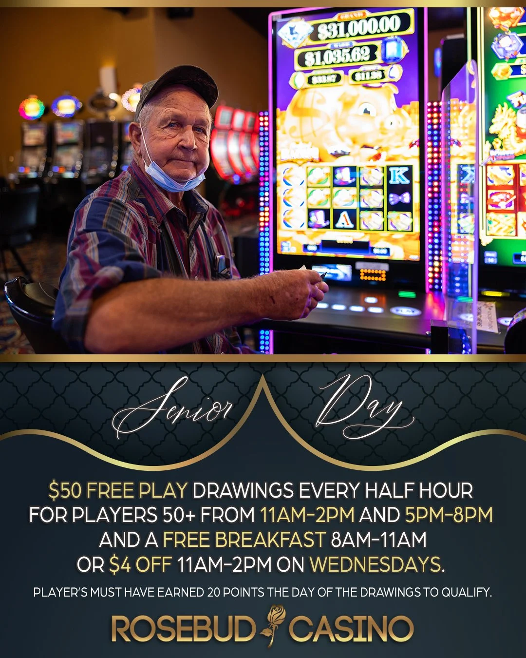 This Wednesday, seniors 50+ can experience the excitement of Senior Day at the Rosebud Casino. Start the day off right with a free breakfast from 8 am to 11 am, or from 11 am to 2 pm; enjoy a discounted meal with $4 off any order. And don't forget to get in on the action as there will be $50 Free Play drawings every half hour from 11 am to 2 pm and from 5 pm to 8 pm. Join us at the Rosebud Casino and take advantage of our great Senior Day offers!