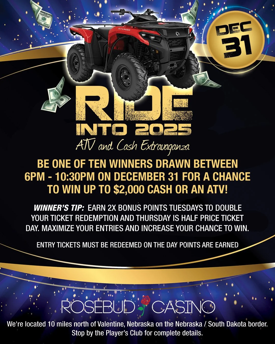Get ready to ride into the new year with our ATV and Cash Extravaganza! We're giving you the chance to win big this December with amazing prizes, including brand new ATVs and up to $2,000 in CASH!