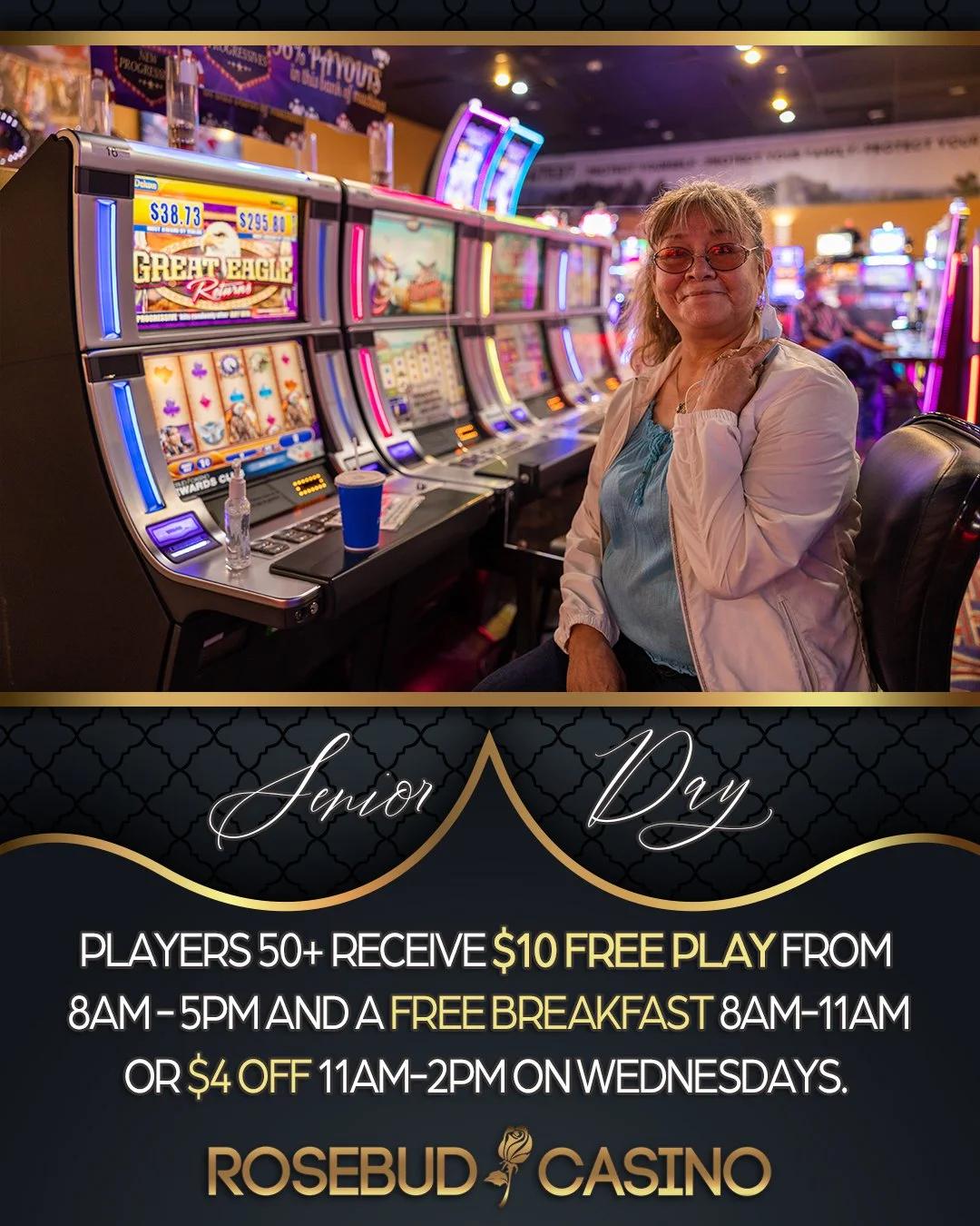 Senior Day Wednesday, May 4, 2022 8:00 AM 5:00 PM Rosebud Casino 30421 U.S. 83 Valentine, NE, 69201 United States (map) Google Calendar ICS $10 in Free Play for Players 50+ Wednesdays are Senior Days at the Rosebud Casino, and if you’re 50+ years young, you’ll receive $10 in free play from 8 am to 5 pm, and a free breakfast between 8 am and 11 am, or a $4 off meal discount between 11 am and 2 pm.