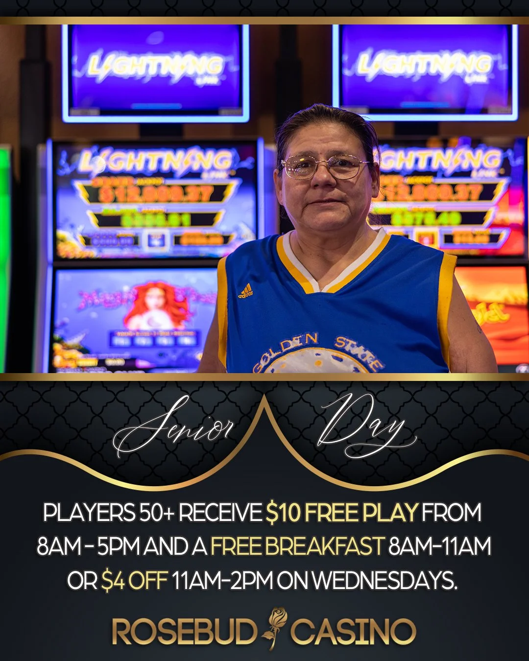 Senior Day Wednesday, April 27, 2022 8:00 AM 5:00 PM Rosebud Casino 30421 U.S. 83 Valentine, NE, 69201 United States (map) Google Calendar ICS $10 in Free Play for Players 50+ Players aged 50+ will receive $10 in free play from 8 am to 5 pm and either a free breakfast from 8 am to 11 am, or a $4 off meal discount from 11 am to 2 pm this Wednesday at the Rosebud Casino 🌹🎰.
