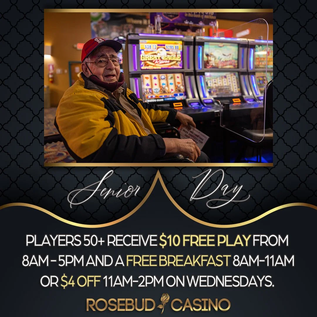 Senior Day Wednesday, March 30, 2022 8:00 AM 5:00 PM Rosebud Casino 30421 U.S. 83 Valentine, NE, 69201 United States (map) Google Calendar ICS If you're in your golden years, 50+ years young, visit the Rosebud Casino to receive $10 in free play from 8 am to 5 pm and a free breakfast from 8 am - 11 am or $4 off from 11 am - 2 pm 🍳🎰.