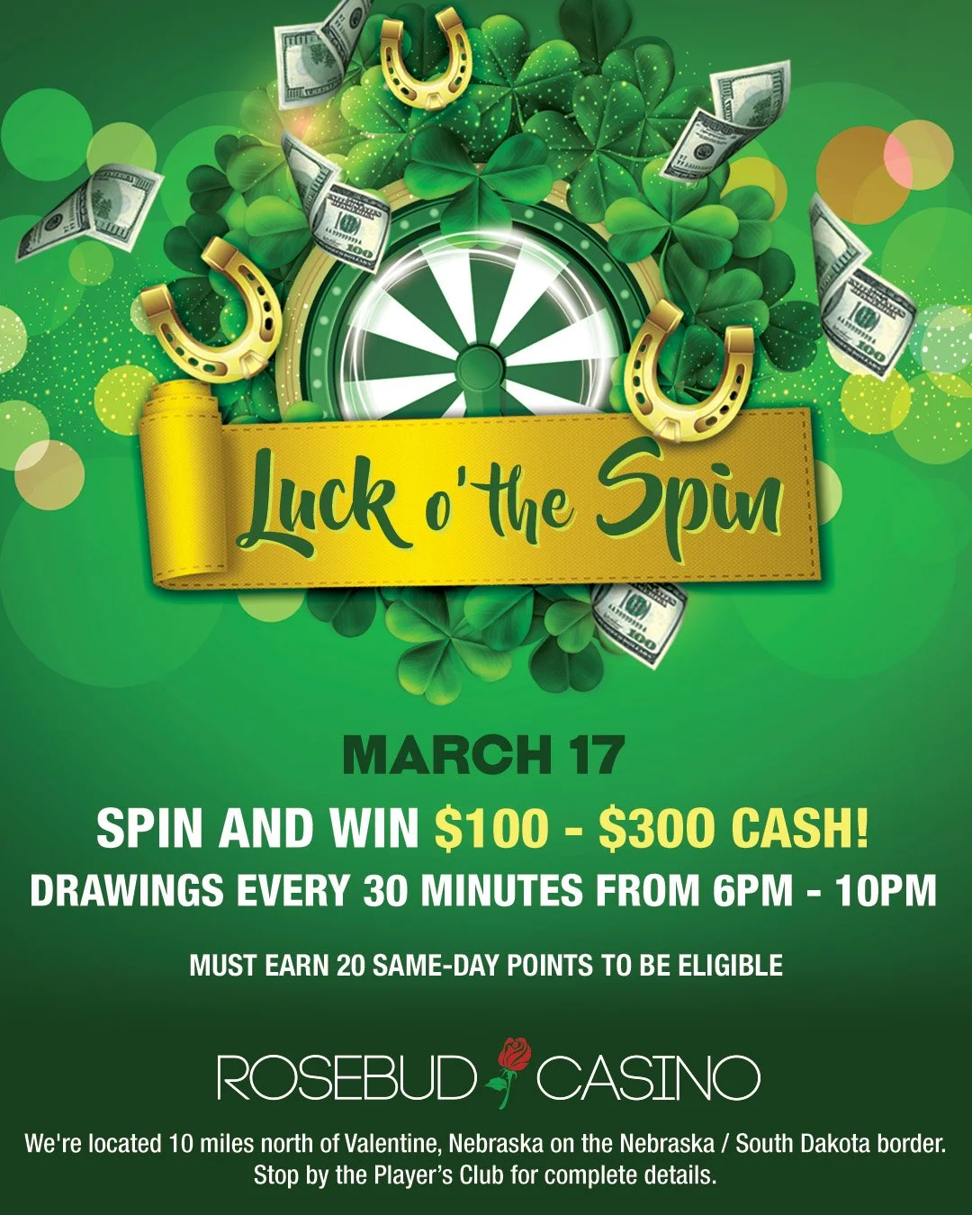 Celebrate St. Patrick's Day at the Rosebud Casino with Luck o' the Spin! Earn 20 points to enter the drawings every 30 minutes from 6 pm to 10 pm. Lucky winners get to spin the wheel for cash prizes ranging from $100 to $300. May the luck of the Irish be with you!