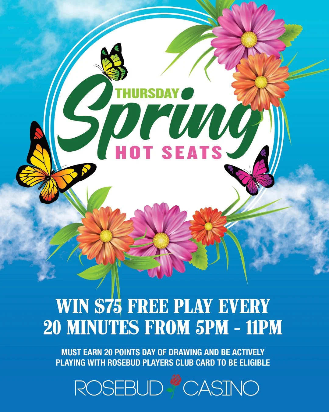 Win $75 in free play every 20 minutes from 5 pm to 11 pm this Thursday during Spring Hot Seats 🔥🎰!