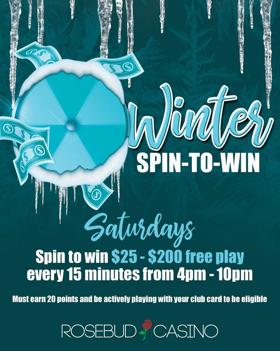 Spin to win $25 to $200 free play every 15 minutes from 4 pm to 10 pm! Visit the Rosebud Casino this Saturday and Spin-to-Win!